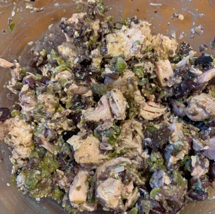 4-Make the Seafood Filling. Mix together the tuna and its oil, anchovies, capers, olives, dried lemon peel, mustard, and remaining tablespoon of red wine vinegar in a bowl. I like to use my chopper attachment to give the anchovies, capers, and olives a quick chop before adding to the other ingredients. You can use fresh lemon zest instead of the dried lemon peel. Stir gently and try not to separate the tuna chunks too much. Set aside.